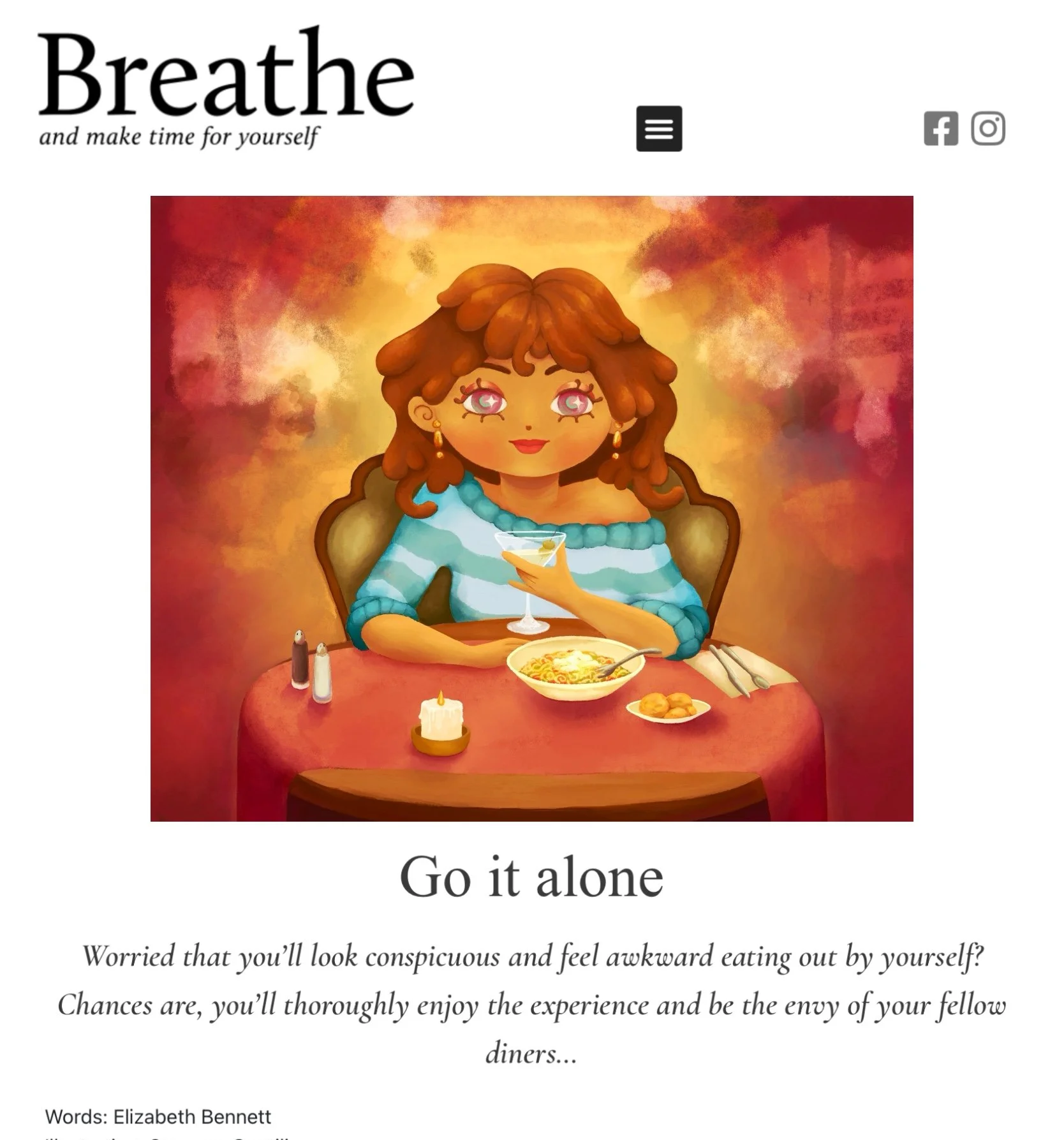 “Go it Alone” Dining alone editorial illustrationArticle by Elizabeth Garrett for Breathe Mag View fullsize View fullsize